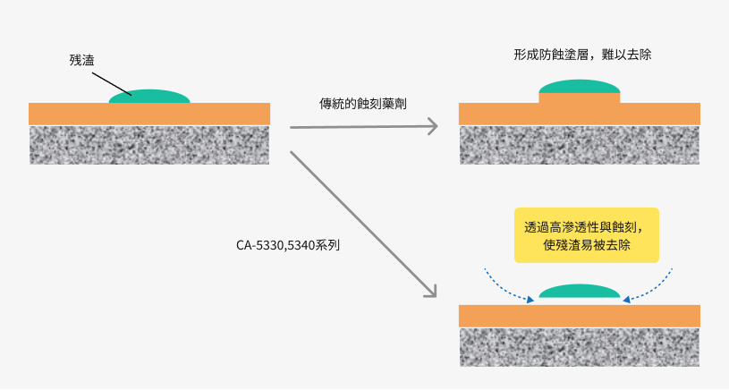 適用於去除防焊(SR)焊盤上的殘留物的藥劑。對於去除SR焊盤上強烈的SR顯影殘留物和滲色特別有效。